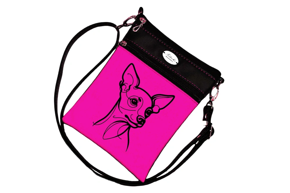 Kabelka je ušitá z koženky, přední díl je z kočárkoviny s mým natištěným obrázkem a pro pevnější tvar je vyztužená. Kabelka má několik zipových kapes - dvě na přední straně, jednu na zadní.