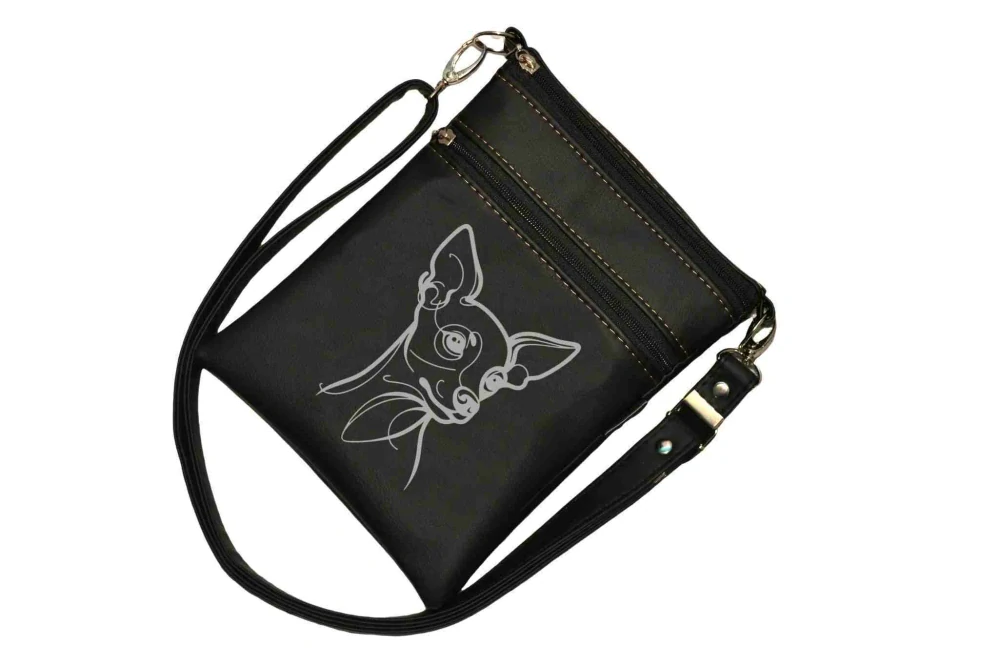 Kabelka je ušitá z koženky, přední díl je z kočárkoviny s mým natištěným obrázkem a pro pevnější tvar je vyztužená. Kabelka má několik zipových kapes - dvě na přední straně, jednu na zadní.