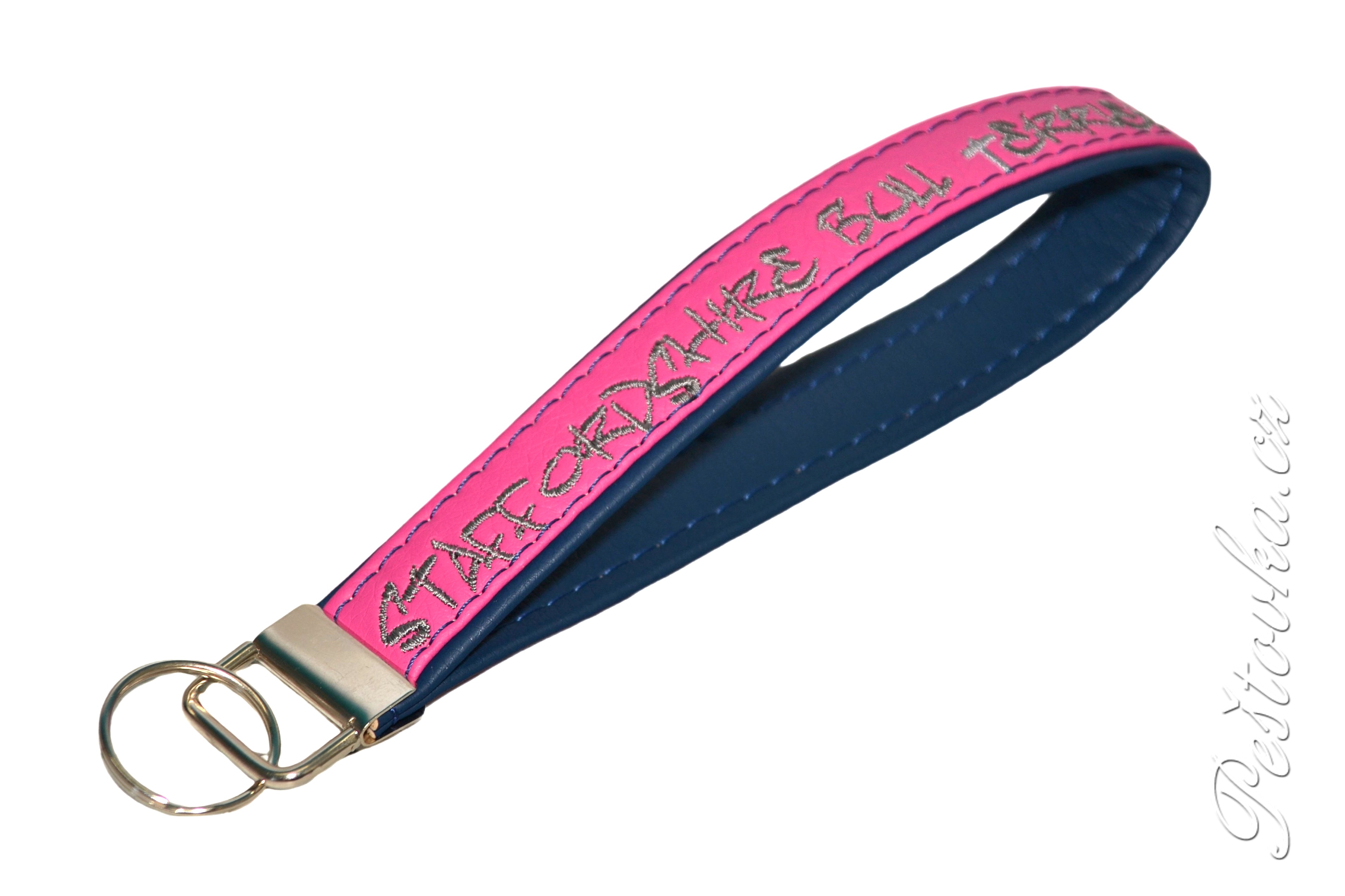 Klíčenka, nebo chcete-li poutko na klíče, s výšivkou nápisu STAFORDSHIRE BULL TERRIER, je ušito z kvalitní zahraniční koženky. Je ukončeno kovovou koncovkou s kroužkem.