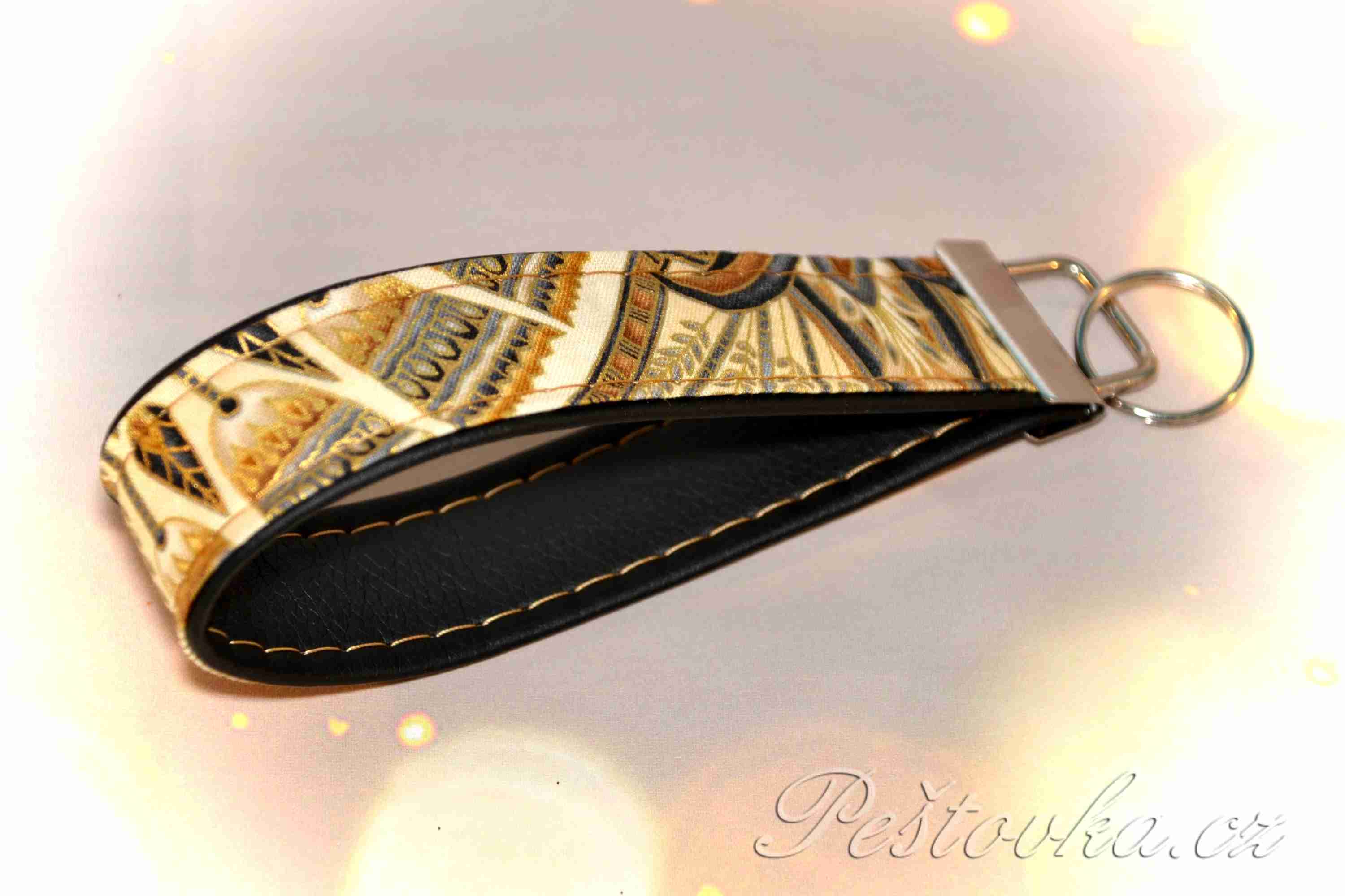 Klíčenka, nebo chcete-li poutko na klíče je ušito z koženky doplněno zahraniční látkou. Je ukončeno kovovou koncovkou s kroužkem.