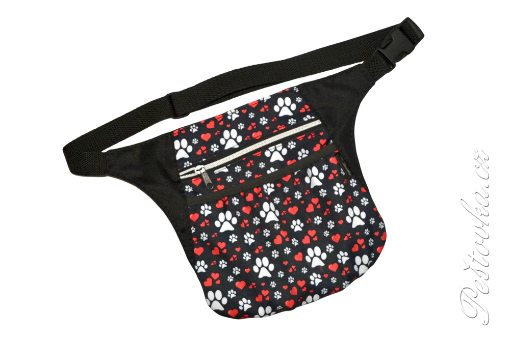 Prostorná kapsička / ledvinka na připnutí kolem pasu. Lze použít i jako prostorný pamlskovník nebo jako příruční kapsu na mobil, když potřebujete mít volné ruce.