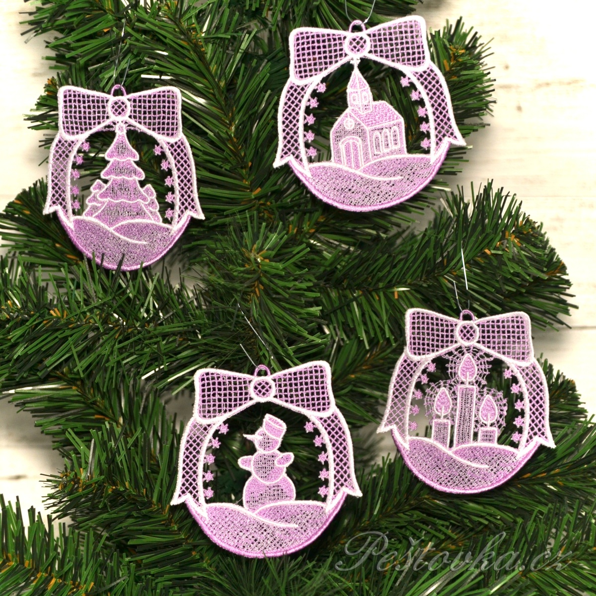 Peštovka - sada 4 ozdob na stromeček *fialovo-bílé*Vyrobíme pro vás do 2 týdnů320 Kč