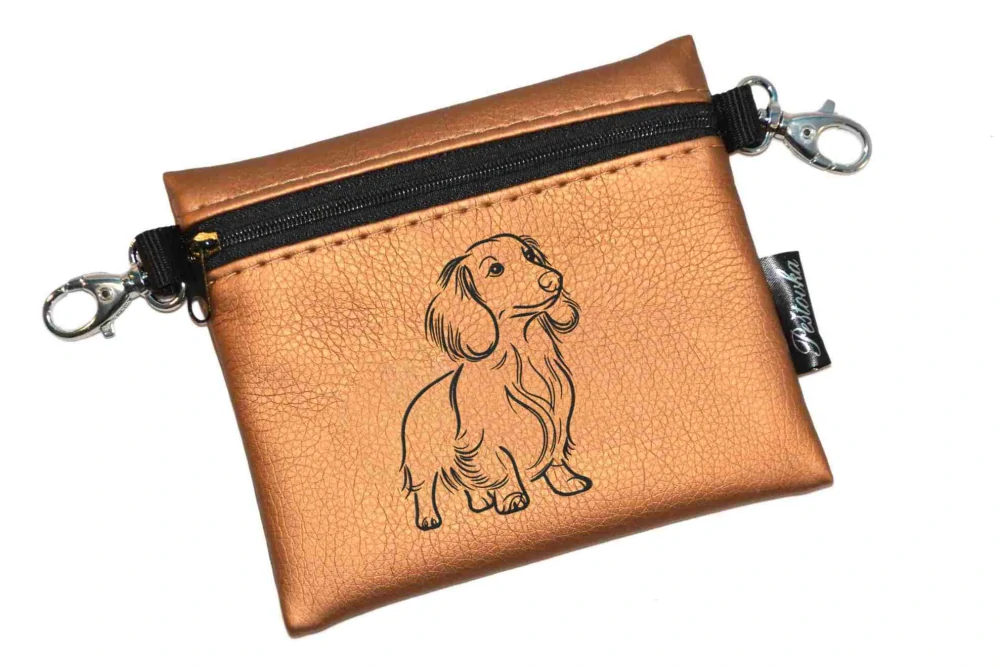 Elegantní pamlskovník se zipem, z krásné zahraniční koženky, je vhodný především jako doplněk při vystavování pejsků na výstavách.