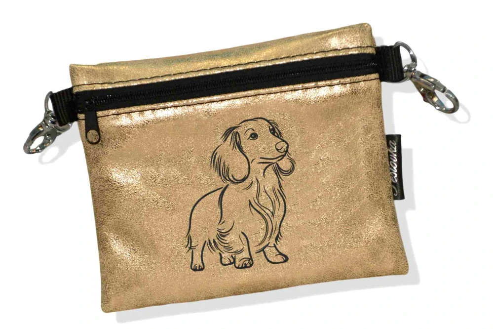 Elegantní pamlskovník se zipem, z krásné zahraniční koženky, je vhodný především jako doplněk při vystavování pejsků na výstavách.
