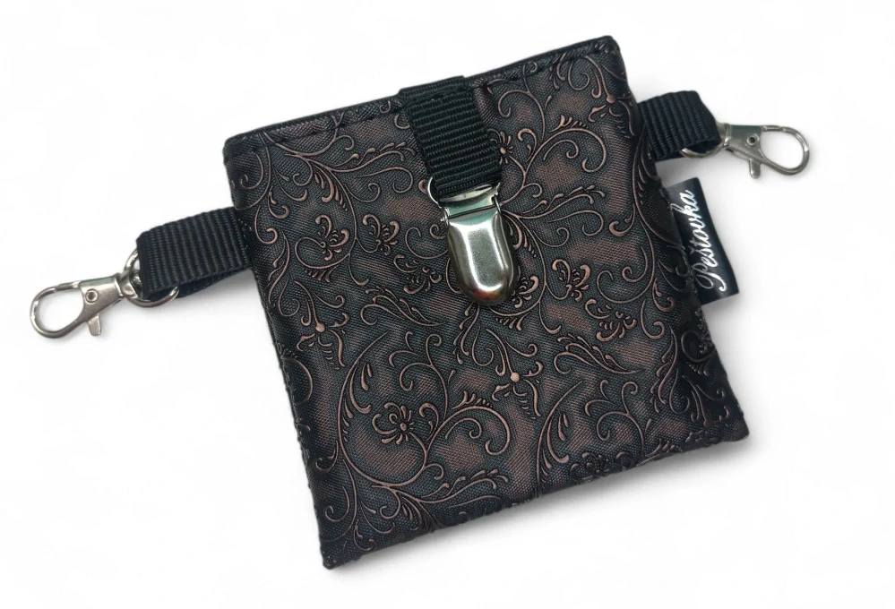 Pamlskovník je ručně šitý z kvalitní zahraniční koženky, která drží tvar, působí elegantně a skvěle doplní váš výstavní outfit. Magnetické zapínání umožňuje rychlý přístup k pamlskům bez zbytečného zdržování – ideální řešení do výstavního kruhu i na tréninky.
