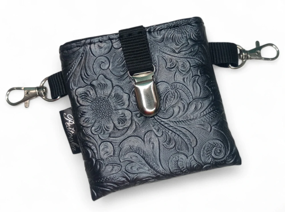 Pamlskovník je ručně šitý z kvalitní zahraniční koženky, která drží tvar, působí elegantně a skvěle doplní váš výstavní outfit. Magnetické zapínání umožňuje rychlý přístup k pamlskům bez zbytečného zdržování – ideální řešení do výstavního kruhu i na tréninky.