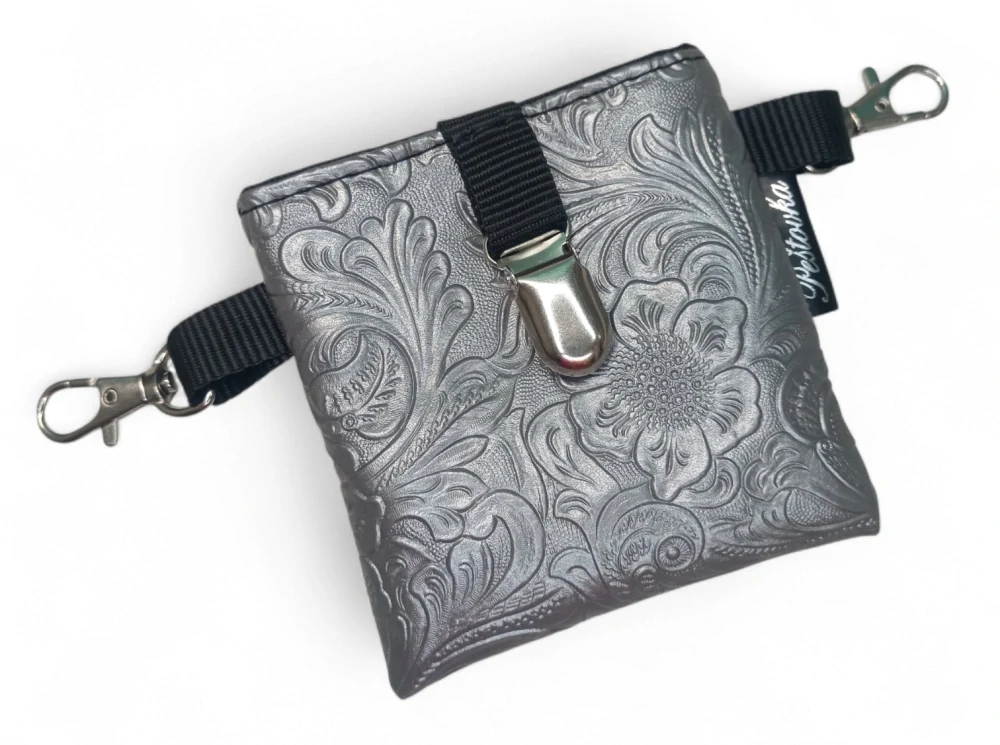 Pamlskovník je ručně šitý z kvalitní zahraniční koženky, která drží tvar, působí elegantně a skvěle doplní váš výstavní outfit. Magnetické zapínání umožňuje rychlý přístup k pamlskům bez zbytečného zdržování – ideální řešení do výstavního kruhu i na tréninky.