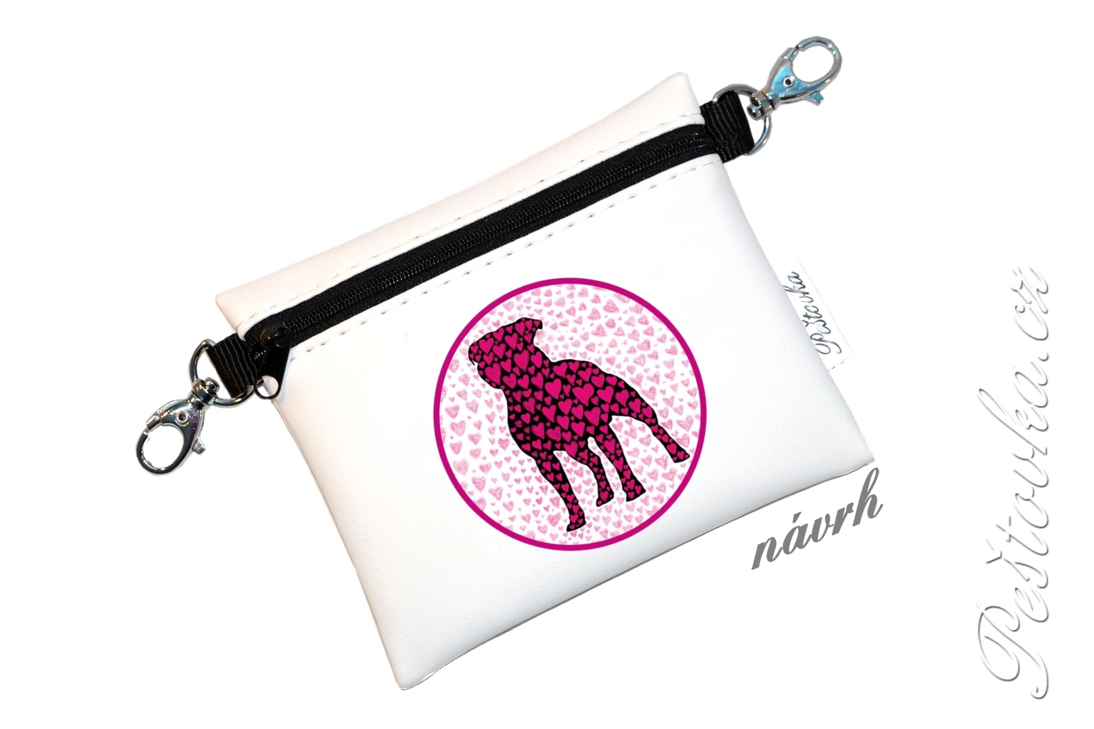 Elegantní pamlskovník se zipem, z krásné zahraniční koženky, je vhodný především jako doplněk při vystavování pejsků na výstavách. Přední strana je doladěna staffbulím potiskem.