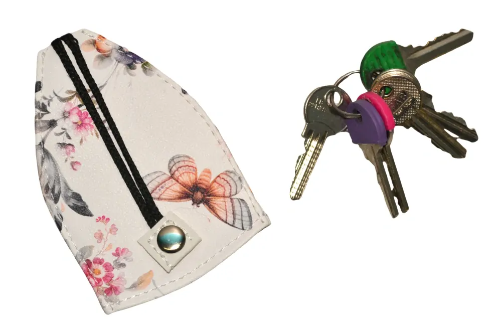 Pouzdro na klíče s kroužkem na šňůrce pomocí které klíče snadno vtáhnete dovnitř. Šňůrku pak přicvaknete k patentu a klíče zůstanou uvnitř. Nepoškodíte si tedy klíči například kapsu nebo podšívku kabelky.