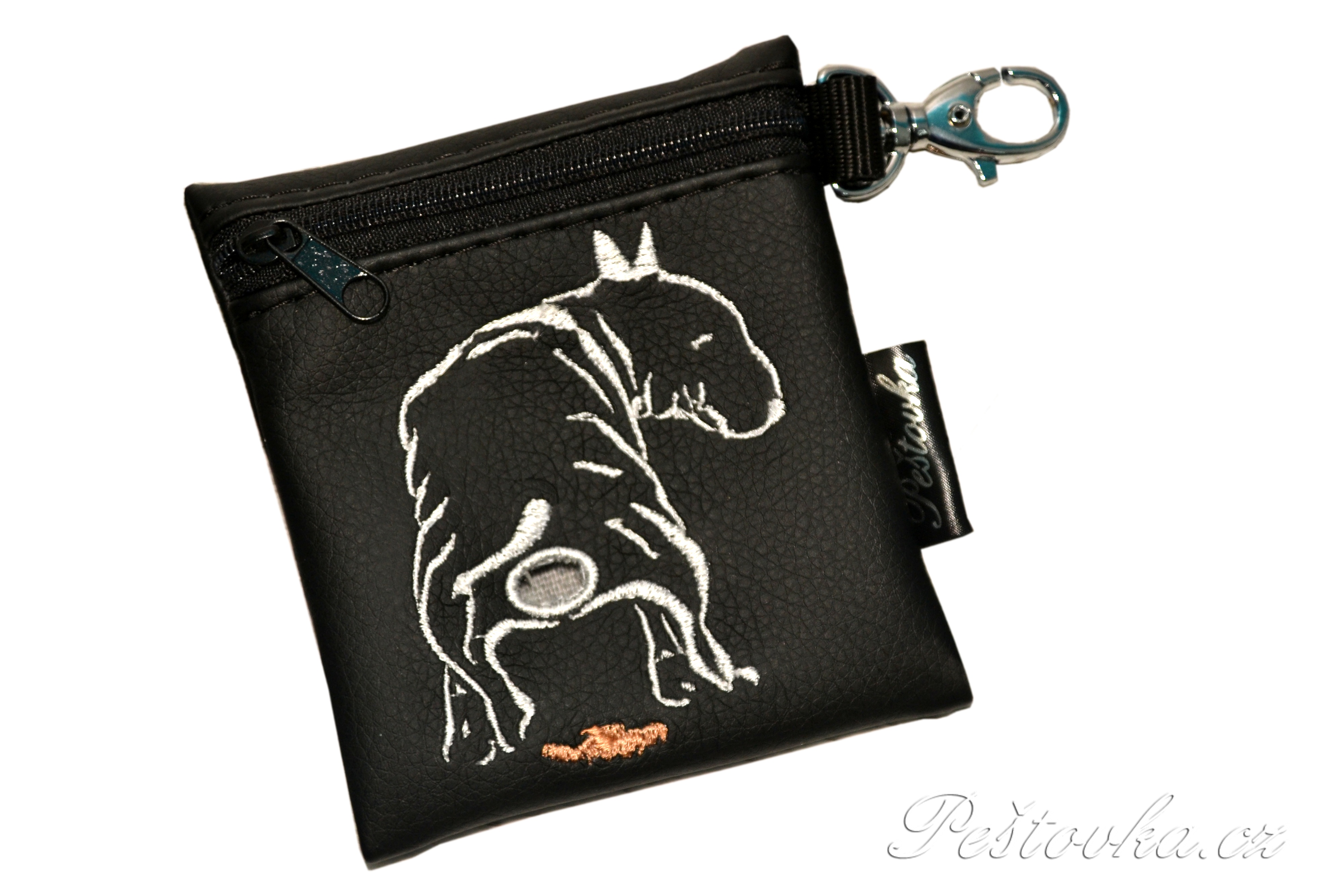 Vyšívaný zásobník/obal na sáčky na extrementy (bobkosáčky). Je ušitý kvalitní koženky, lze ho karabinkou zavěsit na batoh, tašku, klíče nebo vodítko .... prostě tam, kde ho potřebujete mít.