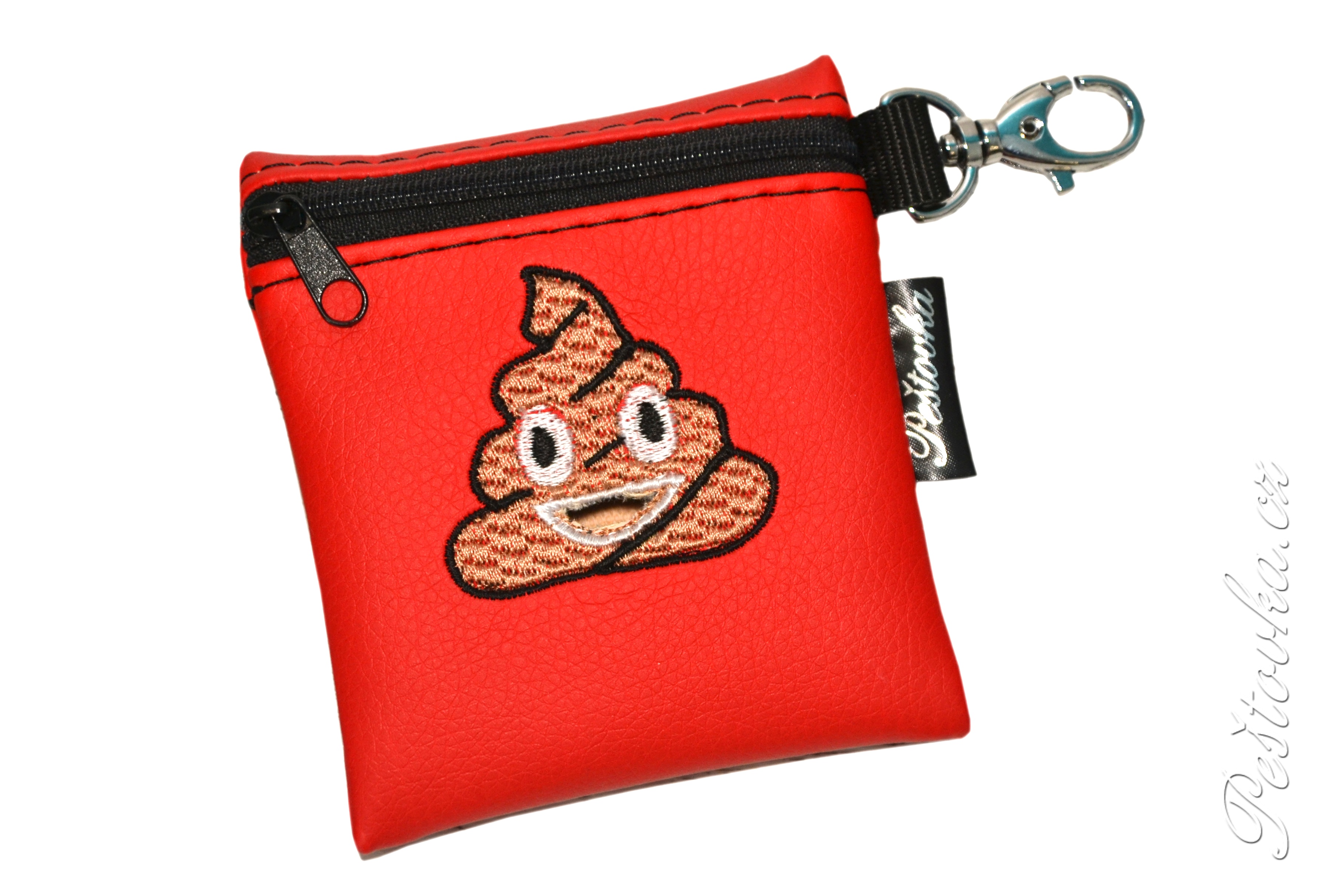 Vyšívaný zásobník/obal na sáčky na extrementy (bobkosáčky). Je ušitý kvalitní koženky, lze ho karabinkou zavěsit na batoh, tašku, klíče nebo vodítko .... prostě tam, kde ho potřebujete mít.